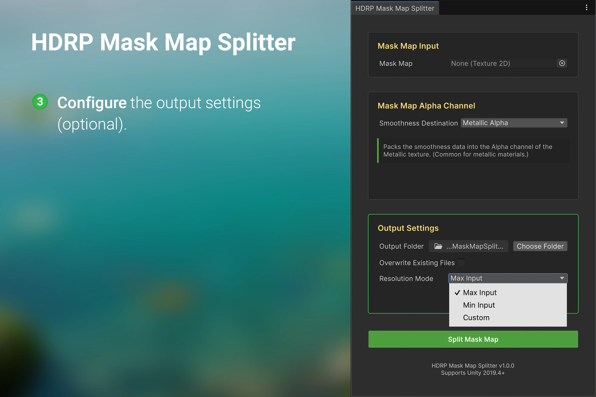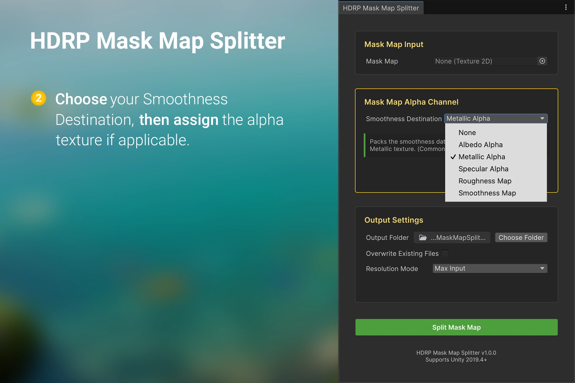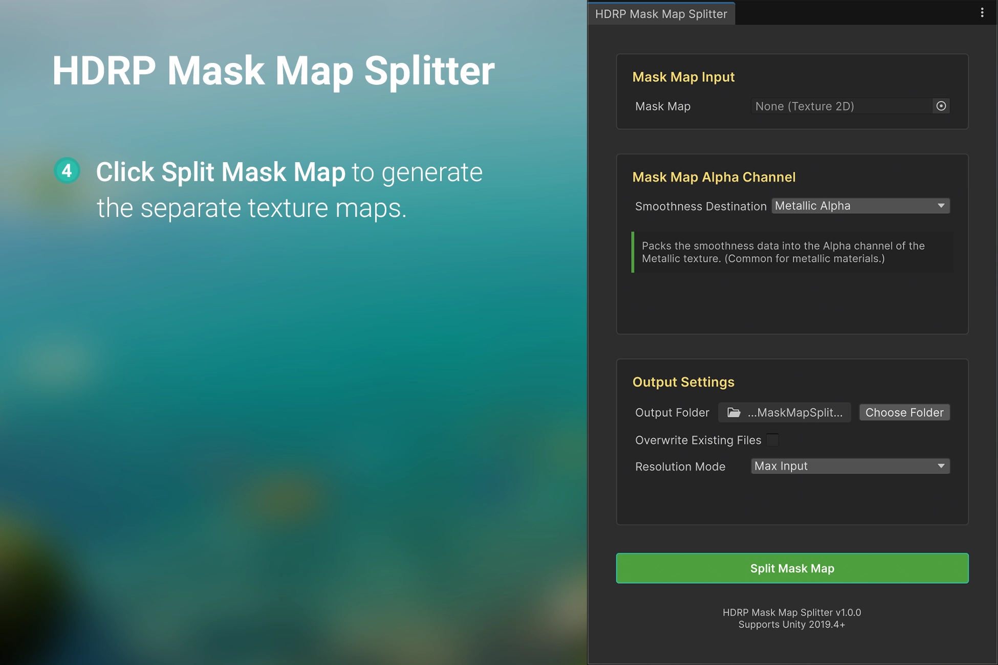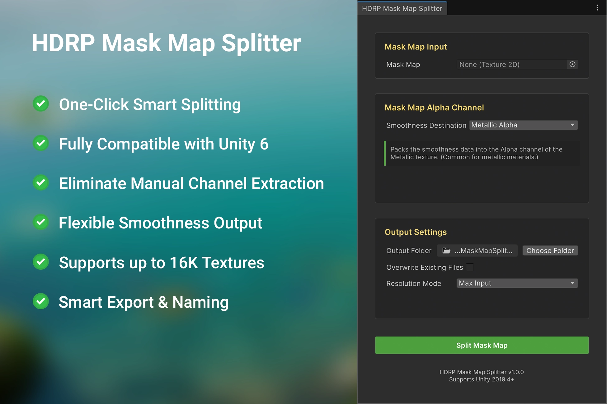 The HDRP Mask Map Splitter solves the challenge of reusing packed HDRP Mask Maps. By deconstructing them back into their original, separate textures, you can easily repurpose these assets or use them across different render pipelines.